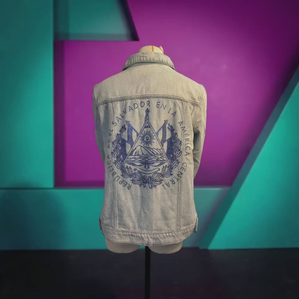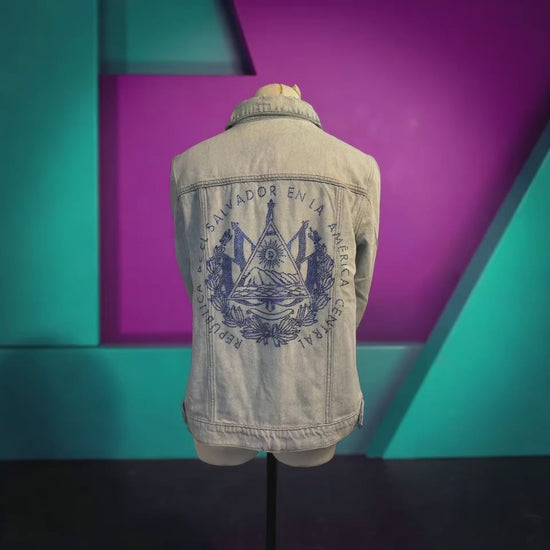 Esta chaqueta de mezclilla decolorada para mujer, en tamaño pequeño, es una pieza única que celebra la herencia de El Salvador. Con el escudo de armas azul adornado con impresionantes rhinestones en la parte posterior, crea un impacto visual llamativo que es tanto atractivo como significativo. La mezclilla decolorada ofrece una sensación suave y vintage, perfecta para salidas informales o para añadir un toque especial a cualquier atuendo. Con su diseño único y su significado cultural, esta chaqueta es una excelente manera de mostrar orgullo mientras te mantienes elegante y cómoda.