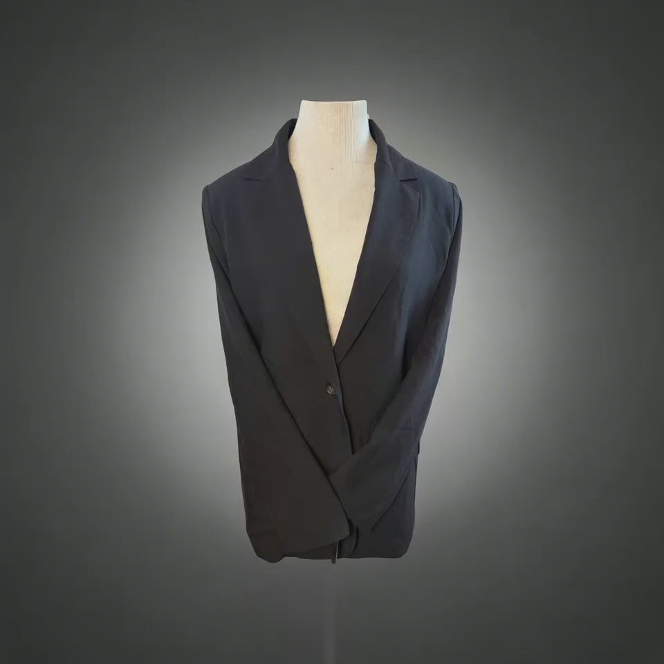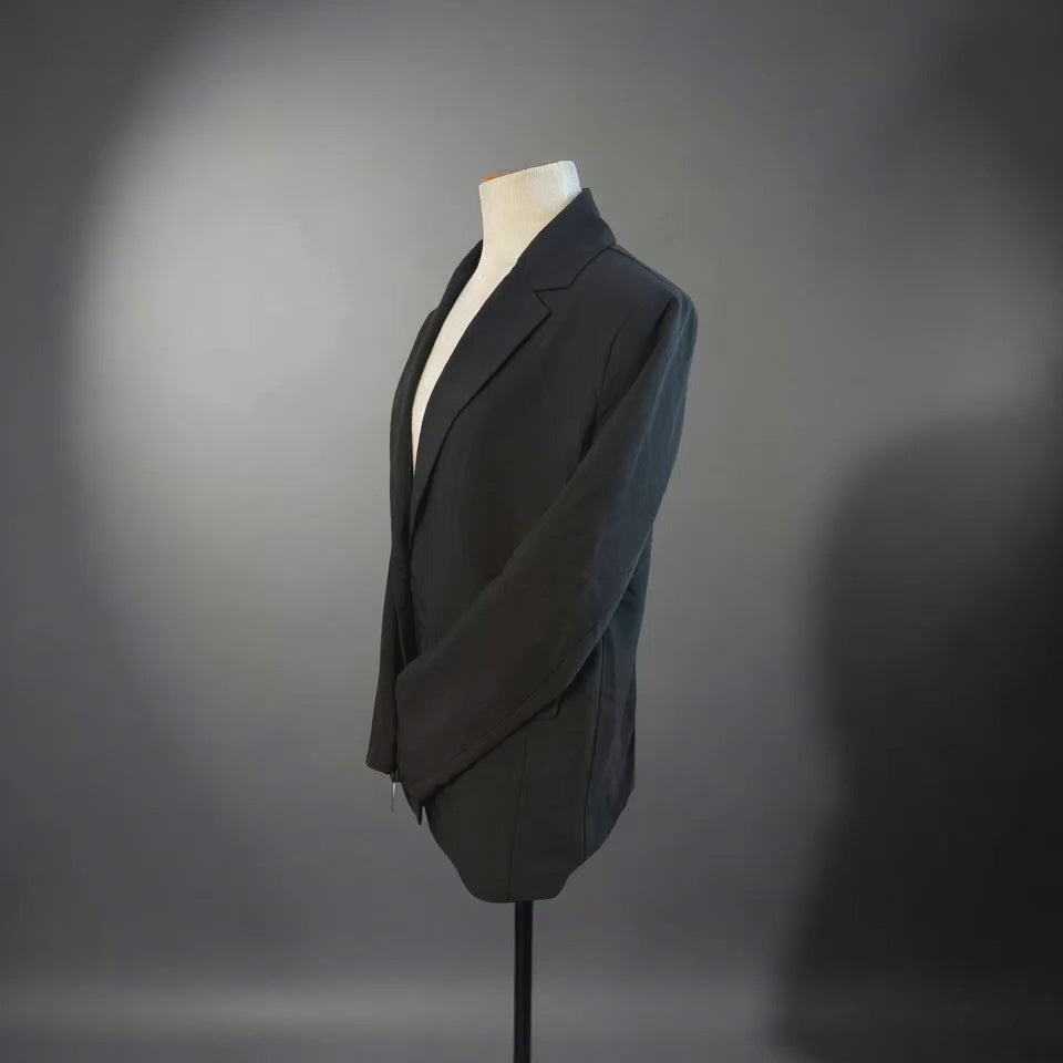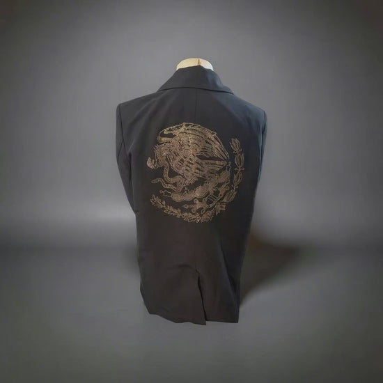 This one-of-a-kind women's black blazer jacket in size medium exudes elegance and individuality. Adorned with the Mexican coat of arms crafted from sparkling gold rhinestones, it adds a striking touch to a classic silhouette. The tailored fit offers a sophisticated look, making it perfect for both professional settings and chic outings. The rich black fabric serves as a versatile canvas, allowing the shimmering coat of arms to stand out beautifully. Elevate your wardrobe with this unique piece that combines cultural pride with contemporary style.