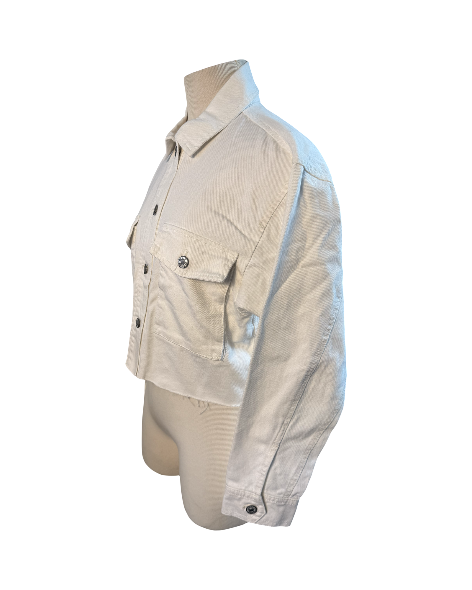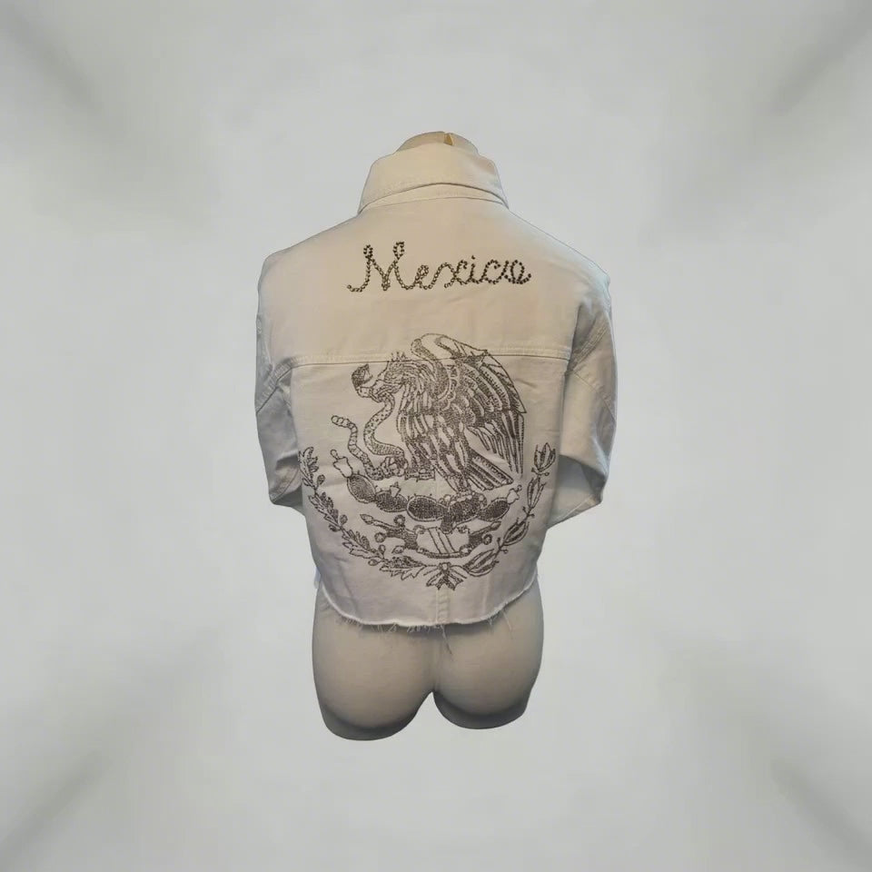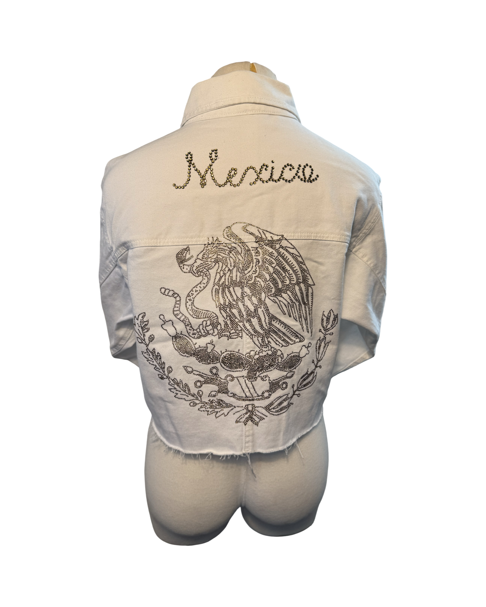 Esta chaqueta de mezclilla blanca recortada para mujer, en tamaño mediano, es una pieza única y estilosa. Adornada con el escudo de armas mexicano en brillantes rhinestones dorados y la palabra "México" destacada arriba, captura la atención y muestra el orgullo cultural. Su diseño corto añade un toque moderno a la silueta clásica de la chaqueta de mezclilla, siendo perfecta para combinar con jeans de tiro alto o faldas. Esta pieza única combina comodidad y estilo, asegurando que te destaques con confianza en cualquier ocasión.